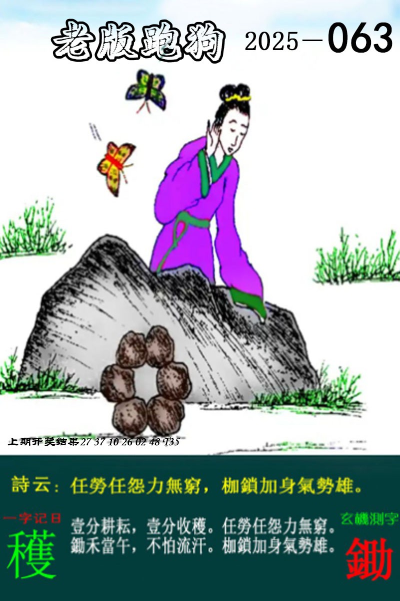 063期老版跑狗一字記之曰:【道】 詩雲: 人面不知何处去,行侠仗义出英豪。胆小如猫,坎坷道路,人面不知何处去。莲花洞木,保家卫国,行侠仪义出英豪!玄機測字:《豪》 解:胆小如猫,胆小生肖:鼠兔龙蛇羊鸡 ============================ 062期老版跑狗一字記之曰:【梭】 詩雲: 阳春三月好景色,劳苦功高无怨言,穿梭草丛,一生之计,阳春三月好景色。早上金黄,九沟八弯,劳苦功高无怨言!玄機測字:《沟》 解:劳苦功高无怨言,大肖:牛虎马羊狗猪。 ============================ 061期老版跑狗一字記之曰:【计】 詩雲: 未曾得向行人道,三心二意出厅招良策妙计,过江名士,未曾得向行人道。两仪八卦,精打细算,三心两意出厅招!玄機測字:《细》 解:良策妙计,大肖:牛虎马羊狗猪。 ============================ 060期老版跑狗一字記之曰:【敗】 詩雲: 爭食門快也門大,自尋死路招失取,同類相残,見慣不怪,爭食門快也門大。不自量力,不識号歹,自尋死路招失敗!玄機測字:《相》 解:同類相残,凶丑:鼠牛虎猴狗猪。 ============================