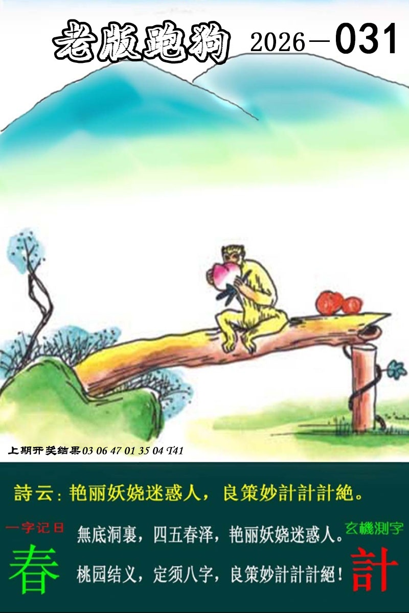 031期老版跑狗一字記之曰:【春】 詩雲:艳丽妖娆迷惑人,良策妙計計計绝。 無底洞裹,四五春泽,艳丽妖娆迷惑人! 桃园结义,定须八字,良策妙計計計絕。 玄機測字:《計》 解:良策妙計計計絕,大肖:牛虎马羊狗猪 ============================ 029期老版跑狗一字記之曰:【啟】 詩雲:功成身退隱山林,晨昏常聞百獸吟。 花開花謝,啟我愚蒙。功成身退隱山林! 否極泰來,富貴窮通。晨昏常聞百獸吟。 玄機測字:《窮》 解:否極泰來,富貴窮通,吉美:兔龙蛇马羊鸡 ============================ 028期老版跑狗一字記之曰:【添】 詩雲:今期生肖出北方,天上神仙有几何。 神州添色,荣华富贵,今期生肖出北方! 良工不示,春风得意,天上神仙有几何。 玄機測字:《意》 解:春风得意,吉美:兔龙蛇马羊鸡 ============================